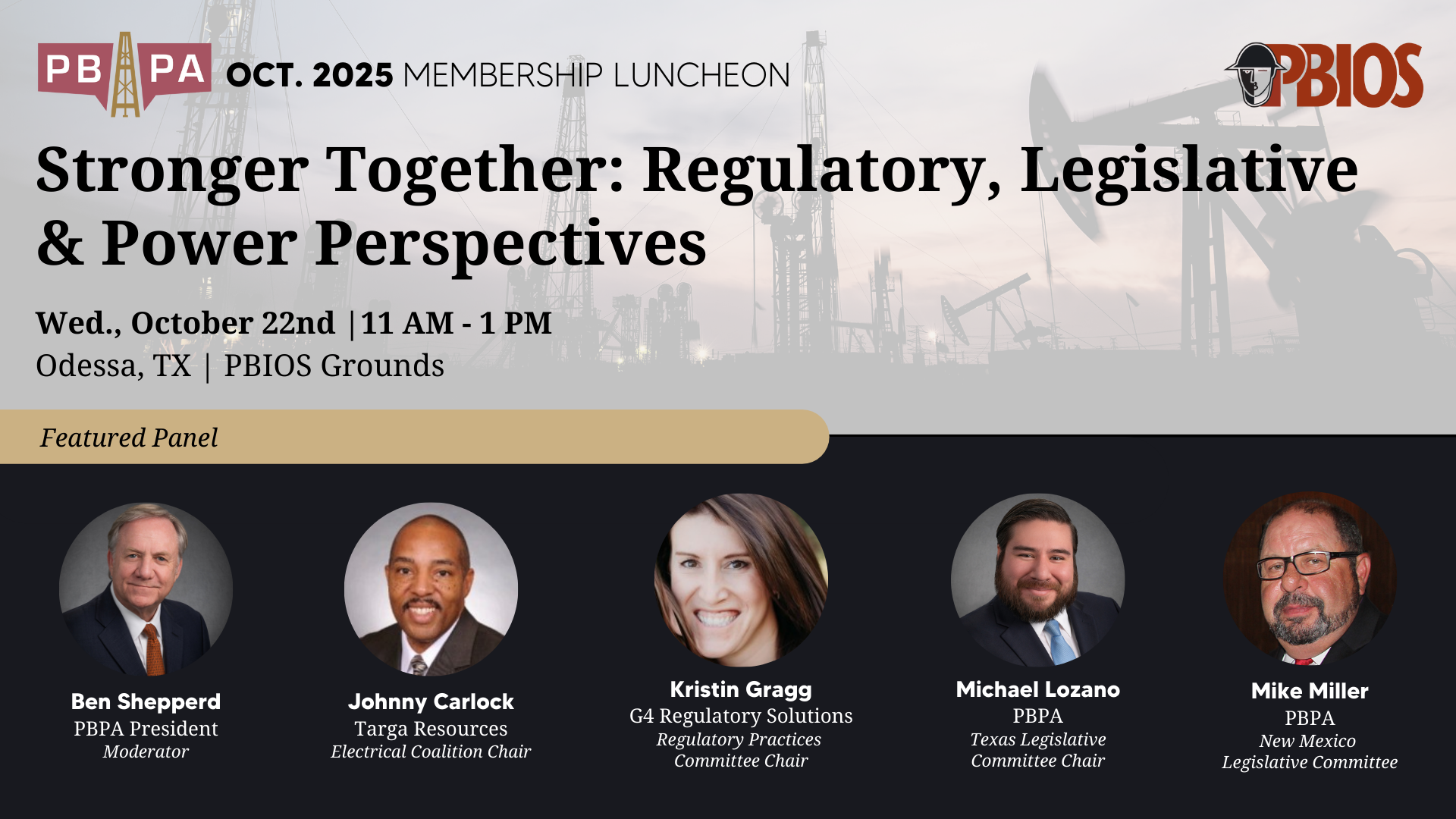 Join the PBPA at the Permian Basin International Oil Show for a special luncheon on Wednesday, October 22nd. Hear directly from PBPA leaders as they share updates on recent Texas & New Mexico legislation, regulatory practices, and electrical infrastructure challenges shaping the Permian Basin. This panel discussion will provide valuable insights into the issues impacting operators and service companies alike. Rarely do PBPA’s committee chairs get together for this type of joint discussion. You won’t want to miss it!