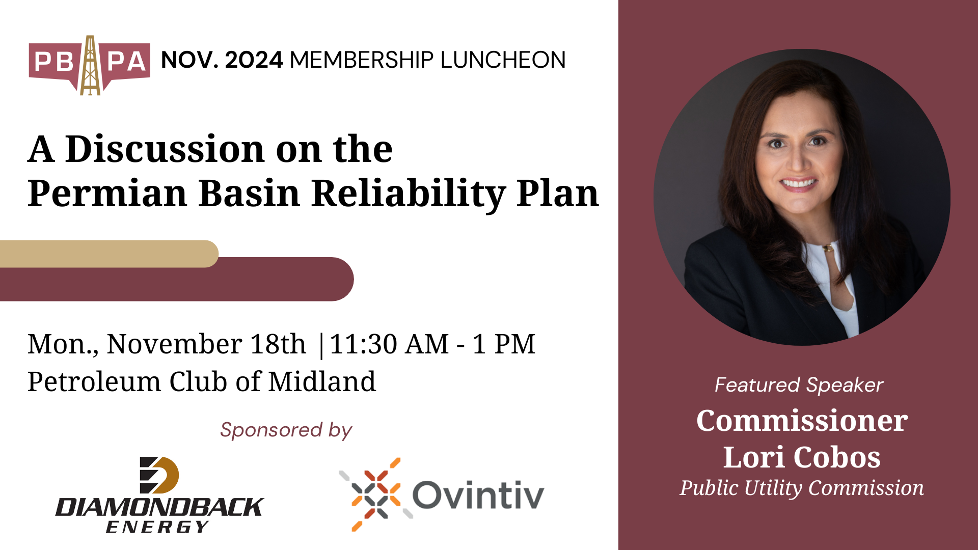 NEXT MONTH: Join us for an insightful discussion with PUC Commissioner Lori Cobos on the Permian Basin Reliability Plan and other critical energy topics.