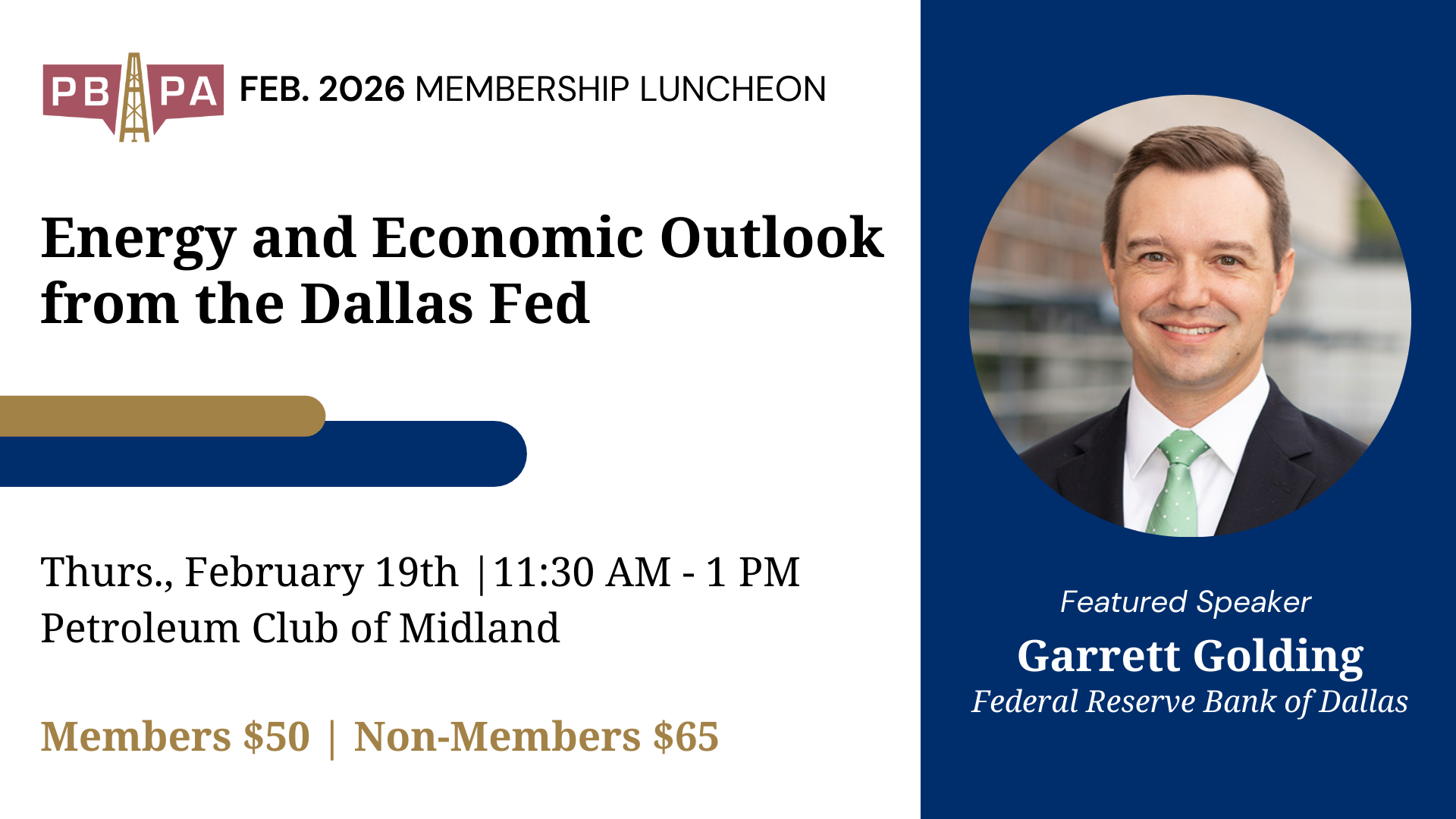 Join us for our February Membership Luncheon, Energy and Economic Outlook from the Dallas Fed, on February 19th at the Petroleum Club of Midland. This luncheon is open to members and non-members alike and will offer timely perspective on the economic forces shaping the energy industry and the broader regional economy.